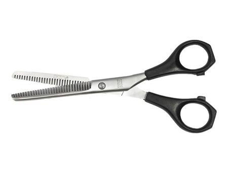 jedna z najtańszych degażówek fryzjerskich z plastikową rączką. Przeznaczone dla każdego, kto potrzebuje przyciąć włosy tzw. metodą degażowania. Znakomicie sprawdzają się "na start" dla uczennic i młodych adeptów zawodu. Degażówki posiadają z jednej strony proste ostrze, z drugiej wycinane w zęby. Nożyczki mogą być poddawane szybkiej dezynfekcji preparatami przeznaczonymi do metalowych narzędzi. Łatwo je wyczyścić i zadbać o ich wygląd.